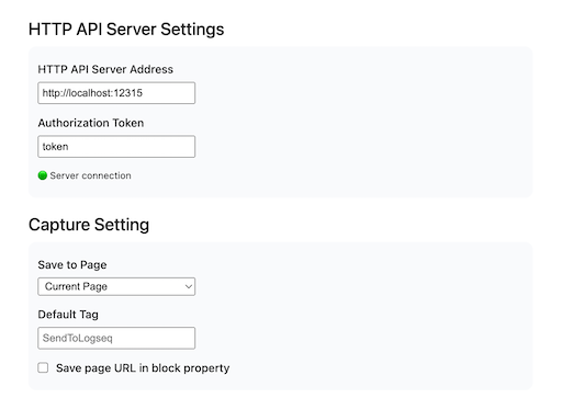 Within the extension’s options, provide the Logseq API server address, token, and capture settings.