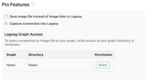 To save image files & screenshots into Logseq, the extension needs access to your graph directory. Click the GRANT button, and select your graph root directory.